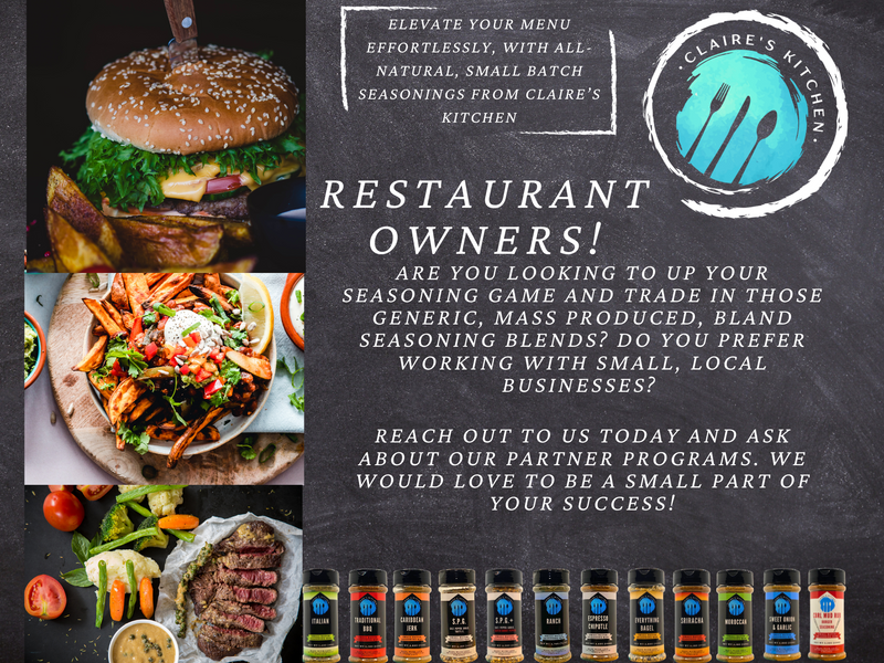 Restaurant Owners. Are you looking for more all natural options for your menu? Are you looking for more flavorful seasoning blends without spending a fortune on labor to make them yourself? We would love to work with you and with 20+ years of Restaurant experience, we know how to help.